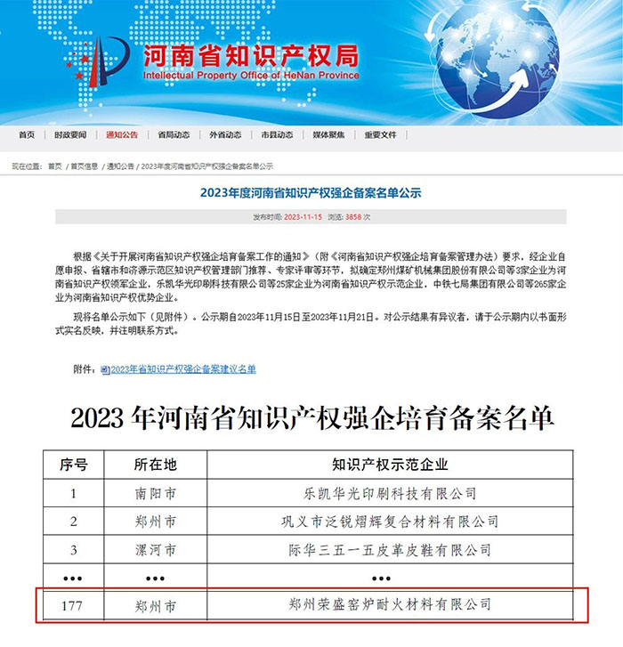 近日,河南省知識產(chǎn)權(quán)局公布2023年度河南省知識產(chǎn)權(quán)強企備案名單,鄭州榮盛窯爐耐火材料有限公司(以下簡稱「榮盛耐材」)榮獲「知識產(chǎn)權(quán)優(yōu)勢企業(yè)」稱號,知識產(chǎn)權(quán)綜合實力獲官方認可。這是今年以來,榮盛耐材在知識產(chǎn)權(quán)領(lǐng)域獲得的又一項榮譽。
