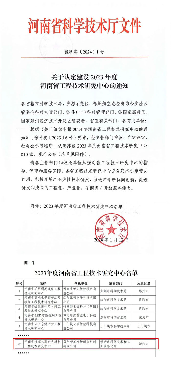 近日,河南省科學(xué)技術(shù)廳發(fā)布了《關(guān)于認(rèn)定建設(shè)2023年度河南省工程技術(shù)研究中心的通知》。經(jīng)申報、主管部門推薦、論證和研究等程序,鄭州榮盛窯爐耐火材料有限公司(以下簡稱“榮盛耐材”)申報的“河南省抗高熱震耐火材料工程技術(shù)研究中心”正式獲批。