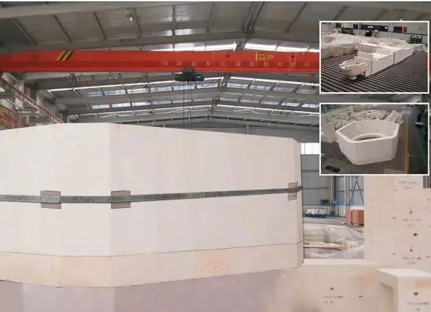 其產品優(yōu)點為:①使用了電熔氧化硅結合相,不含氧化鈣成分,二氧化硅含量可達98.5%以上;②密度更小(1.8g/cm3),降低了整個大碹的重量;③價格相比同級別電熔材料更低;④比硅磚具有更低的膨脹系數(shù)(650℃時0.6%)、更高的使用溫度(T0.5為1690℃);⑤更好的體積穩(wěn)定性。在國內某全氧燃燒窯爐上有使用經歷,但大碹出現(xiàn)威脅到窯爐的變形問題。