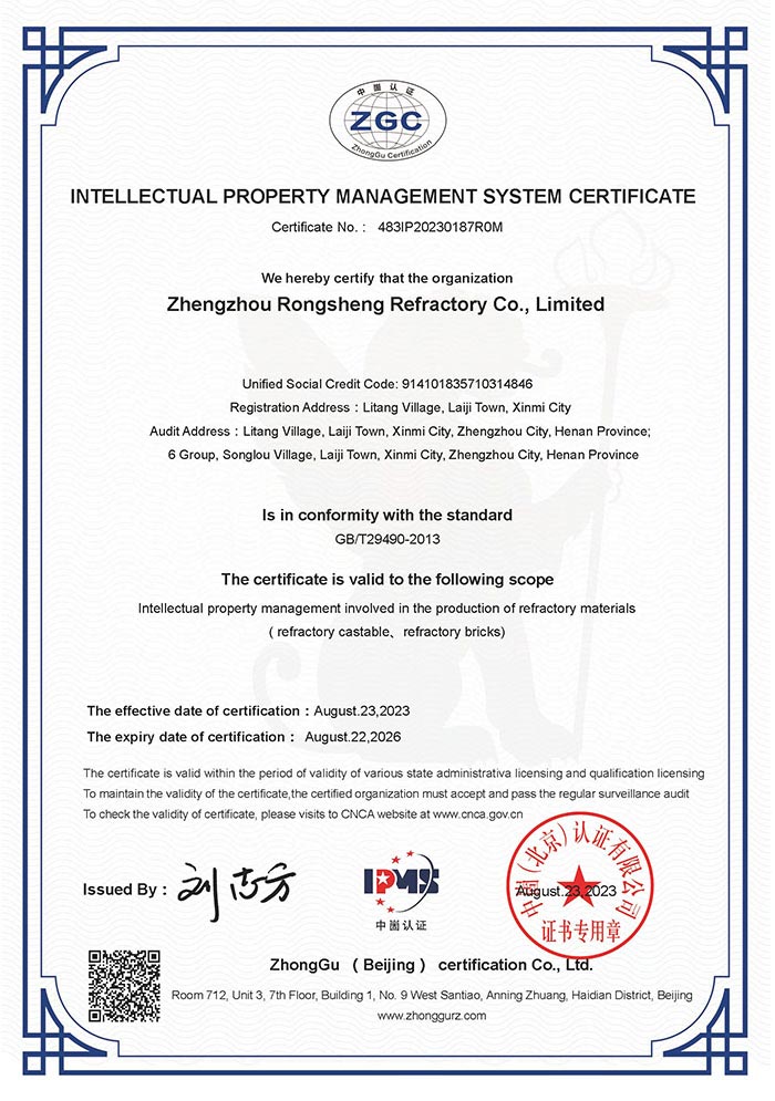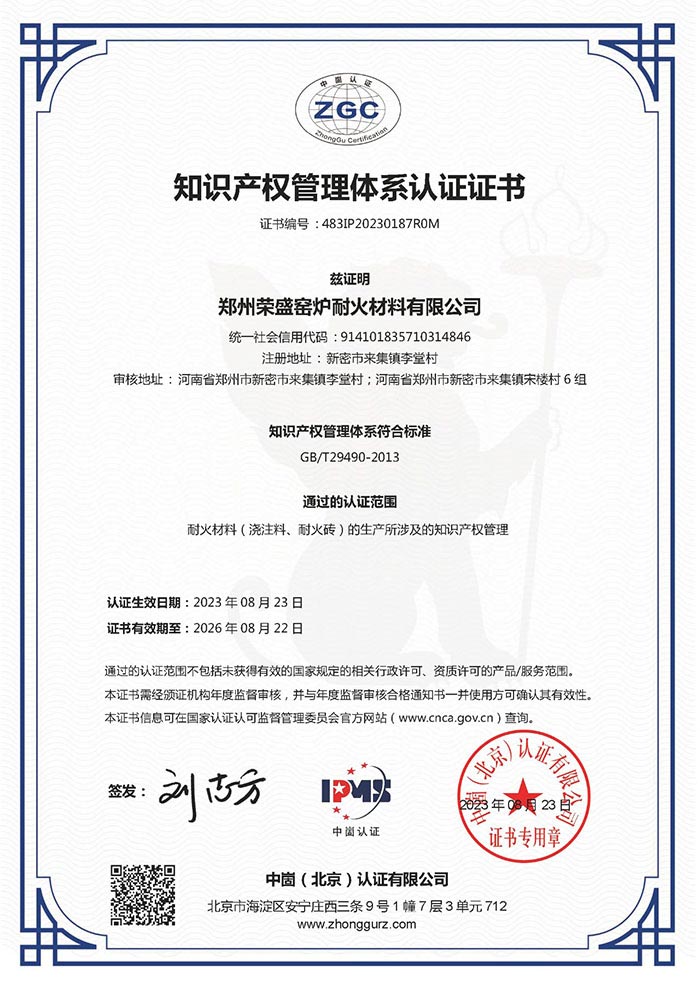 近日,鄭州榮盛窯爐耐火材料有限公司(以下簡(jiǎn)稱「榮盛耐材」)順利通過知識(shí)產(chǎn)權(quán)貫標(biāo),并獲得了《知識(shí)產(chǎn)權(quán)管理》中英文雙語。該項(xiàng)的順利通過,標(biāo)志著榮盛耐材構(gòu)建了一套規(guī)范化、系統(tǒng)化、程序化、精細(xì)化的知識(shí)產(chǎn)權(quán)管理。